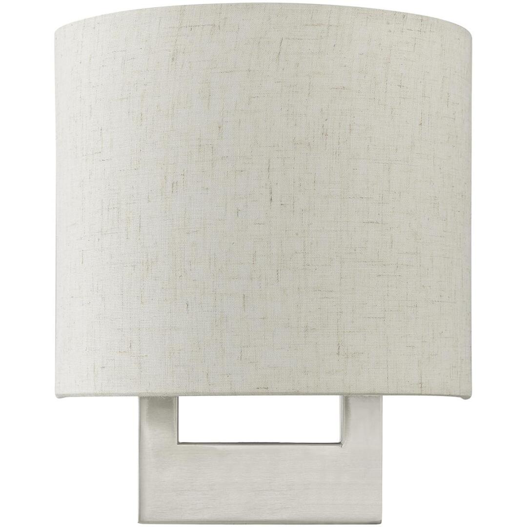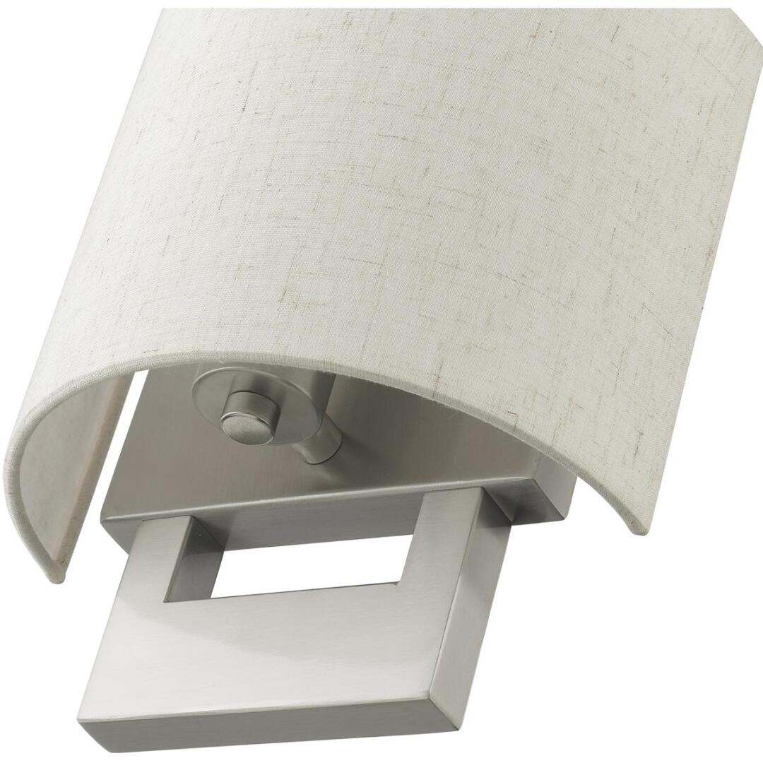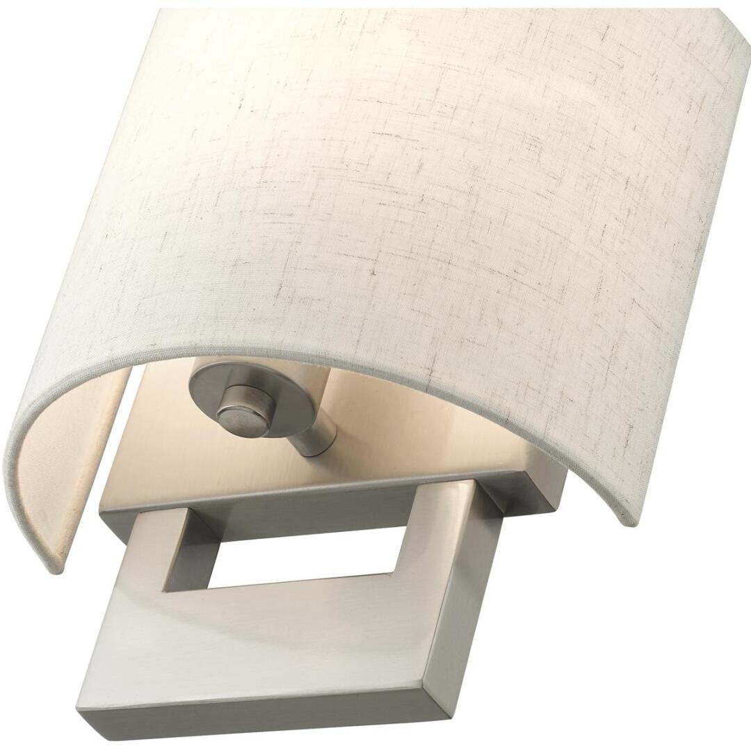 Raise the style bar with a designer wall sconce in a handsome and versatile contemporary manner. This one light wall sconce comes in a brushed nickel finish with a rectangular oatmeal fabric hardback shade.