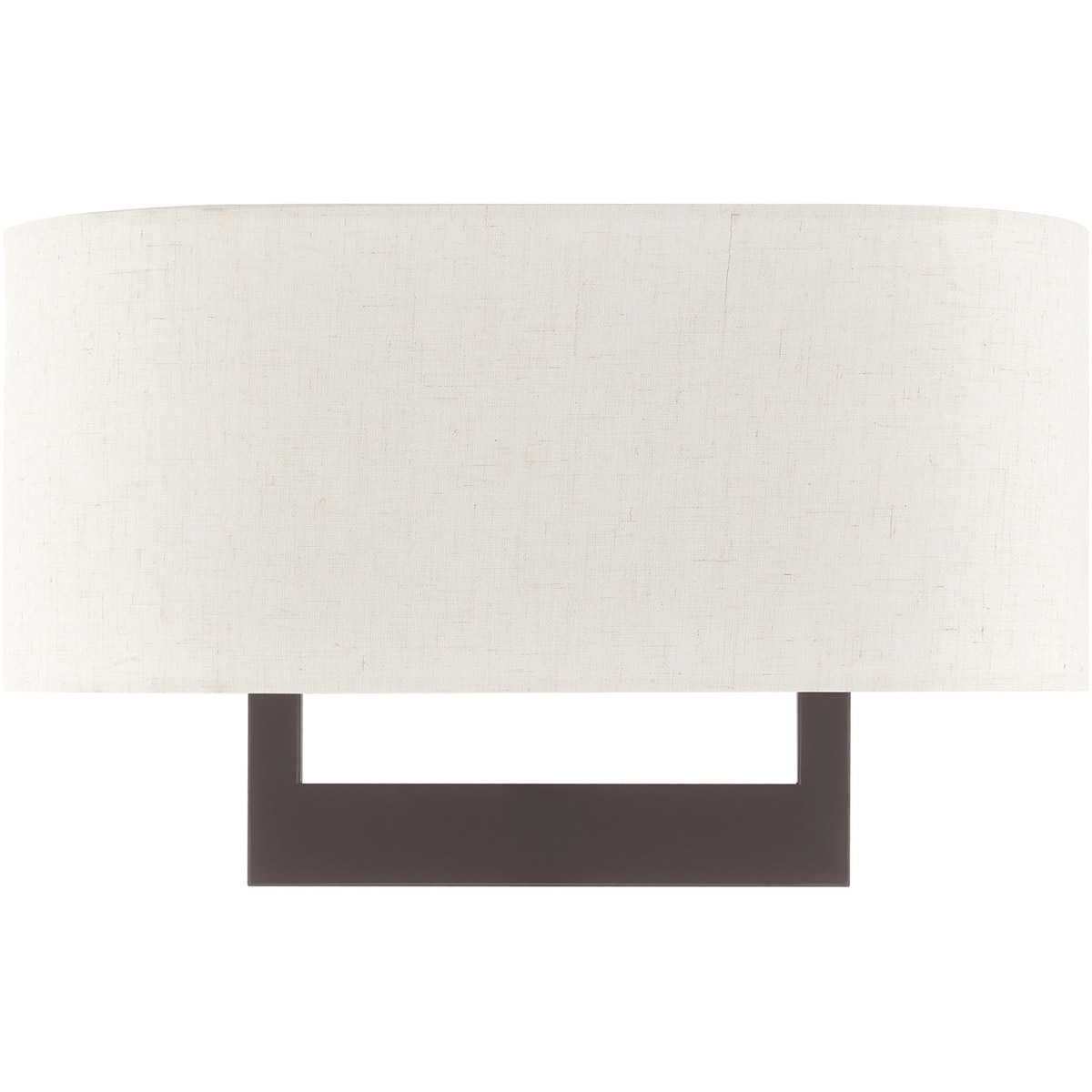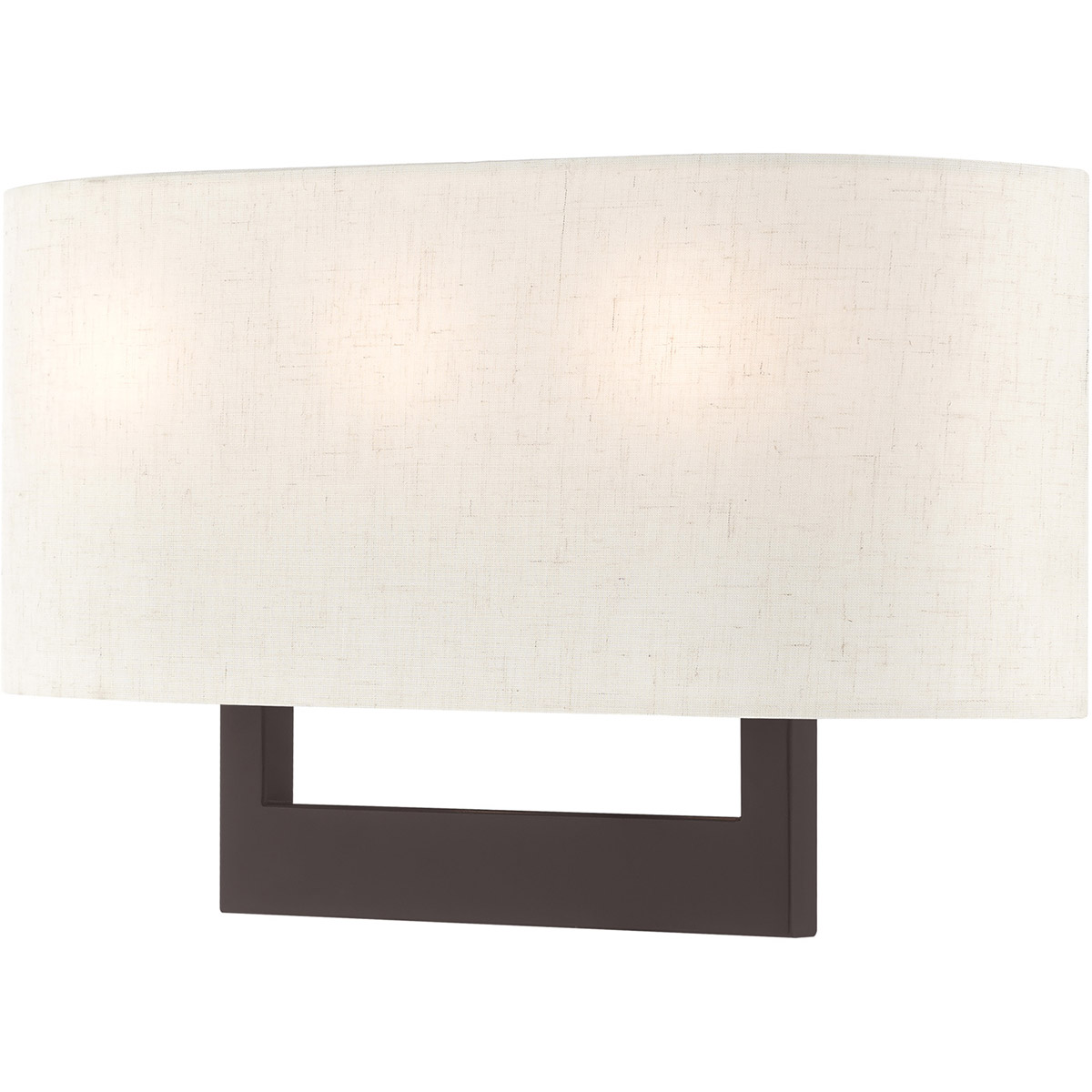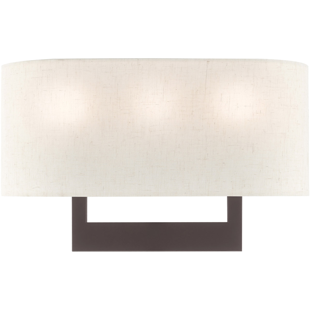 Raise the style bar with a designer wall sconce in a handsome and versatile contemporary manner. This three light wall sconce comes in a bronze finish with a rectangular oatmeal fabric hardback shade.