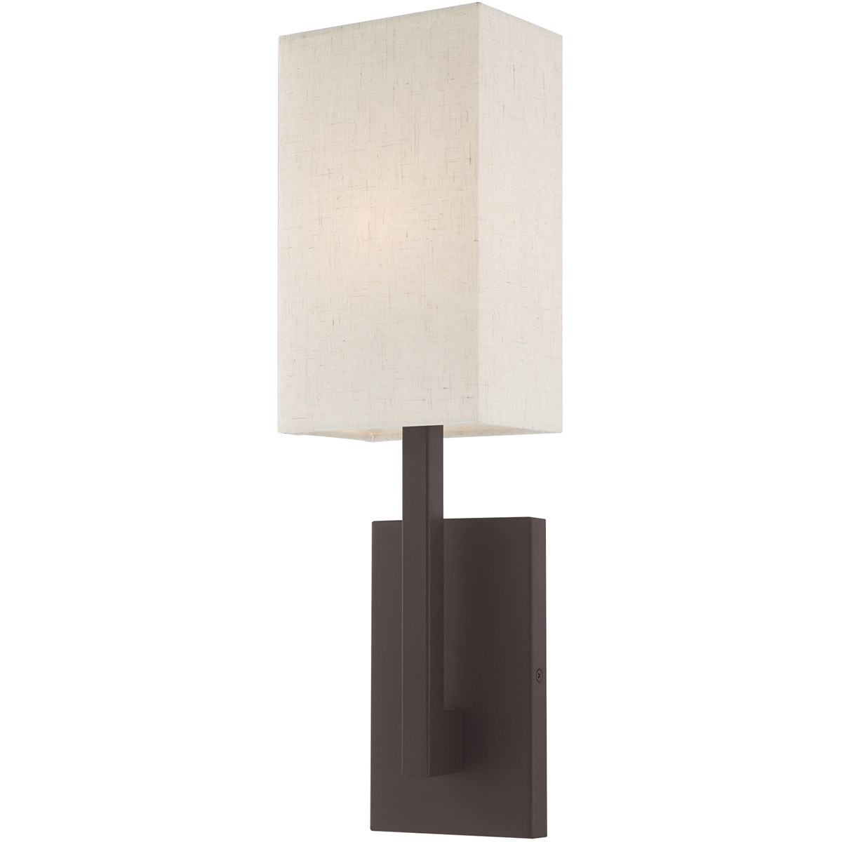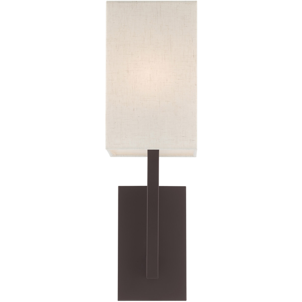 Raise the style bar with a designer wall sconce in a handsome and versatile contemporary manner. This one light wall sconce comes in a bronze finish with a rectangular oatmeal fabric hardback shade.