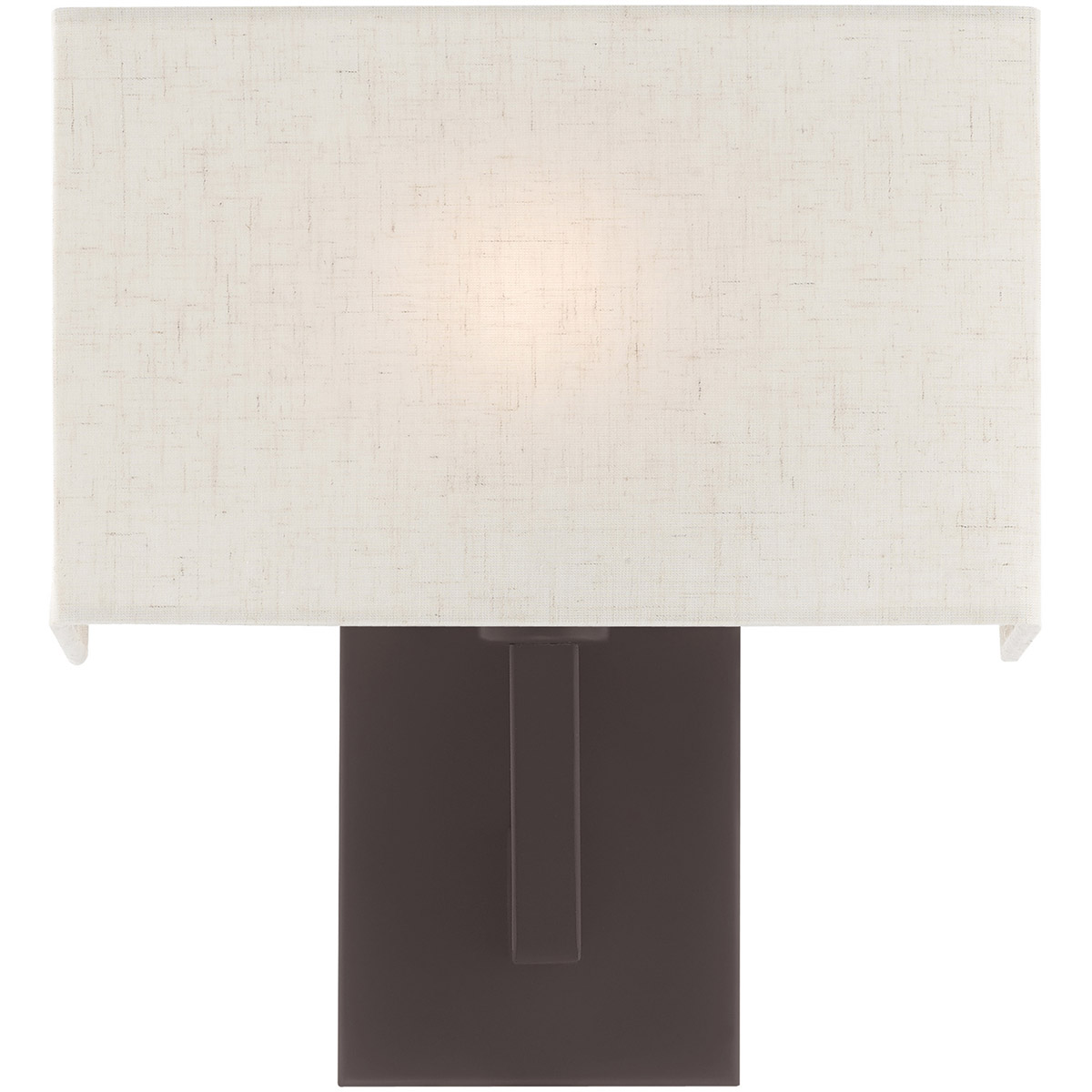 Raise the style bar with a designer wall sconce in a handsome and versatile contemporary manner. This one light wall sconce comes in a bronze finish with a rectangular oatmeal fabric hardback shade.