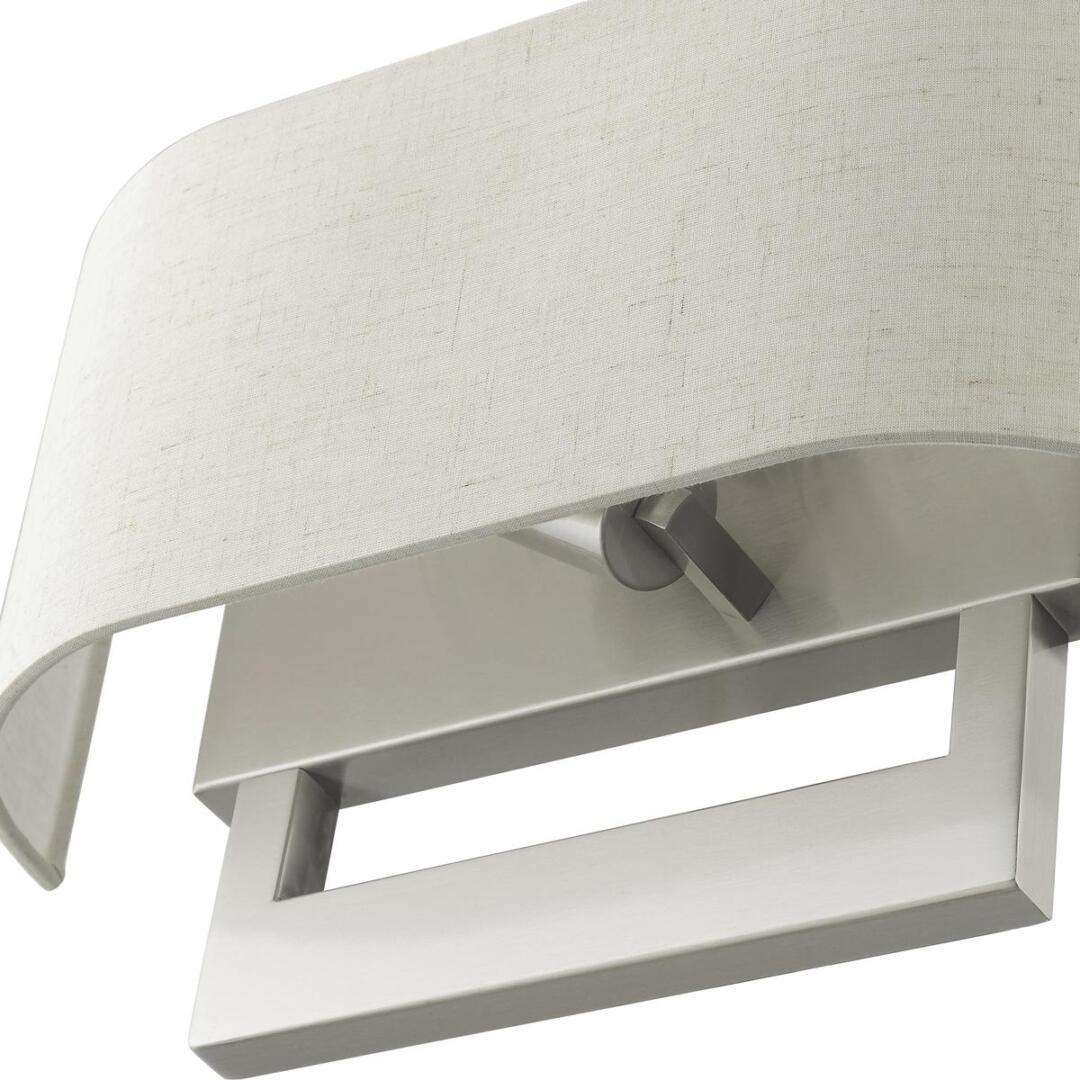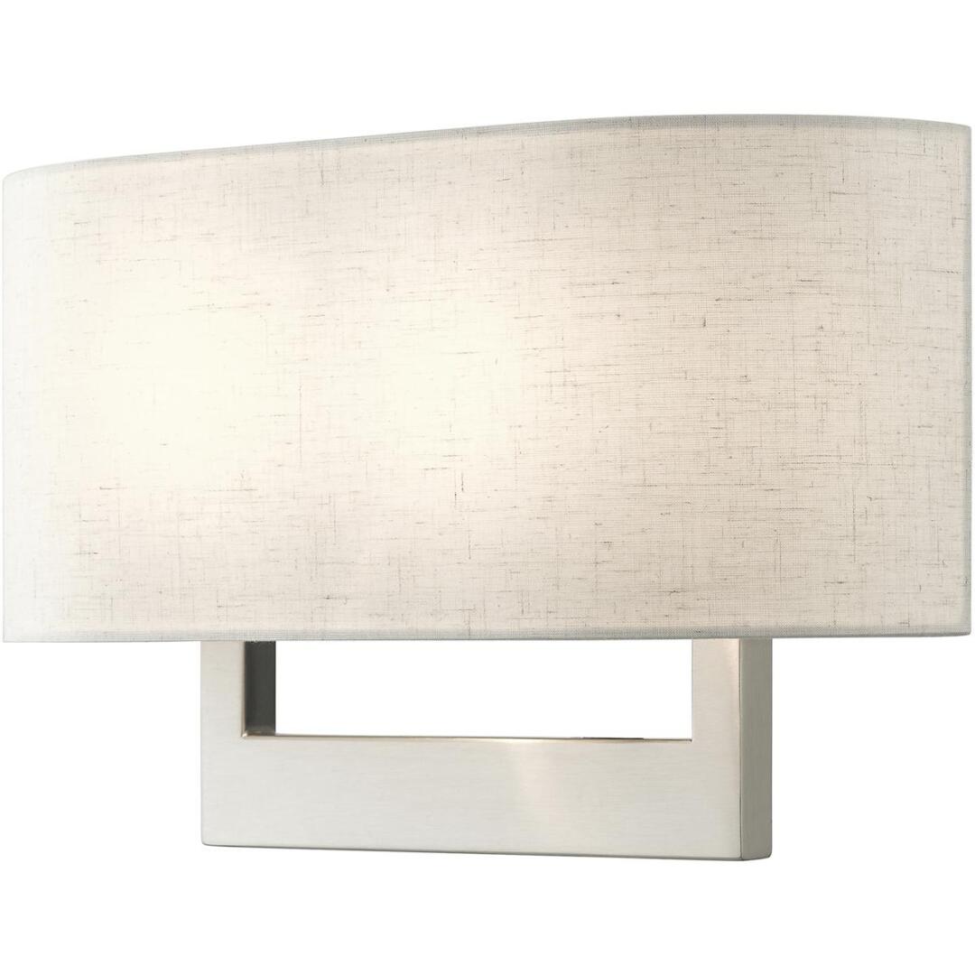 Raise the style bar with an ADA wall sconce in a handsome and versatile contemporary manner. This large two light wall sconce comes in a brushed nickel finish with a rectangular oatmeal fabric hardback shade.
