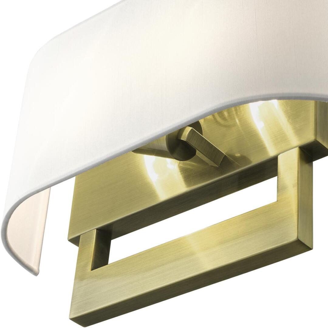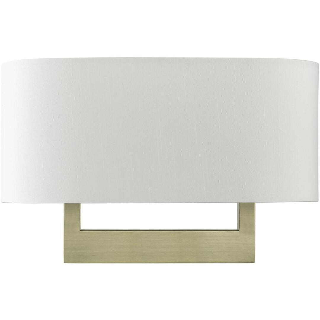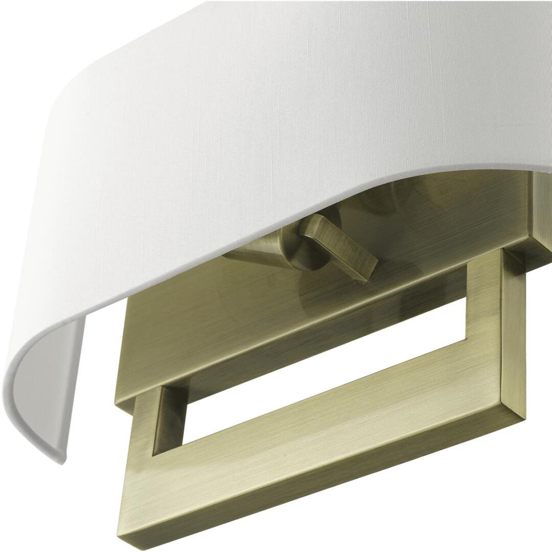 Raise the style bar with a designer large ADA sconce in a handsome and versatile contemporary manner. This two light wall sconce comes in an antique brass finish with a rectangular off-white fabric hardback shade.