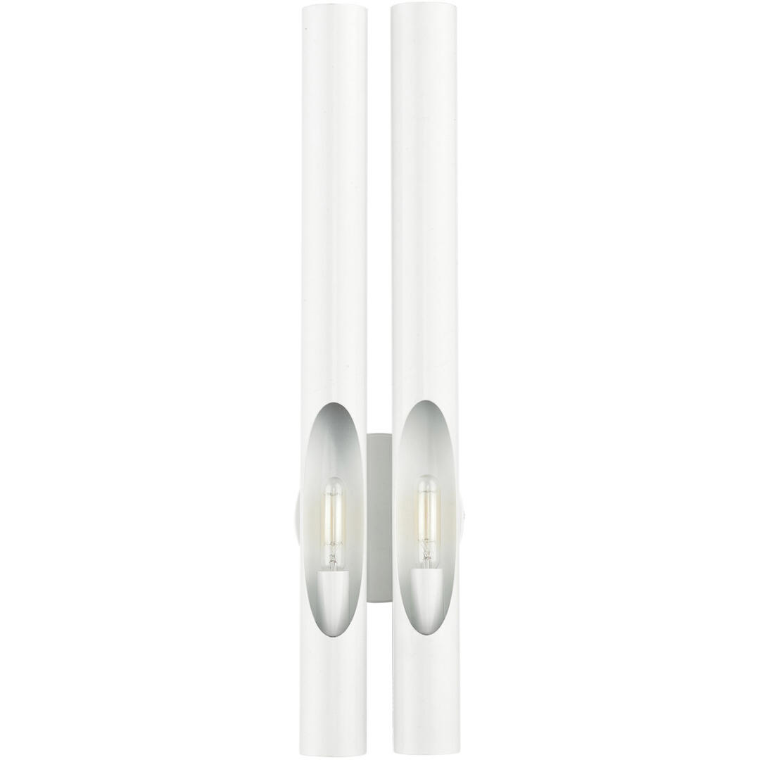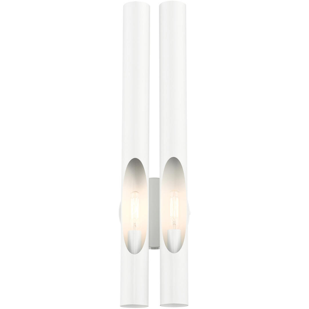 The minimalistic Acra collection was inspired by the industrial landscape of metropolitan cities across Europe and Asia. Delicate tubular shapes are interrupted by clever cutouts to create a visually interesting light distribution. This double light shiny white finish sconce will integrate into a contemporary, minimal, urban or sleek interior design setting.