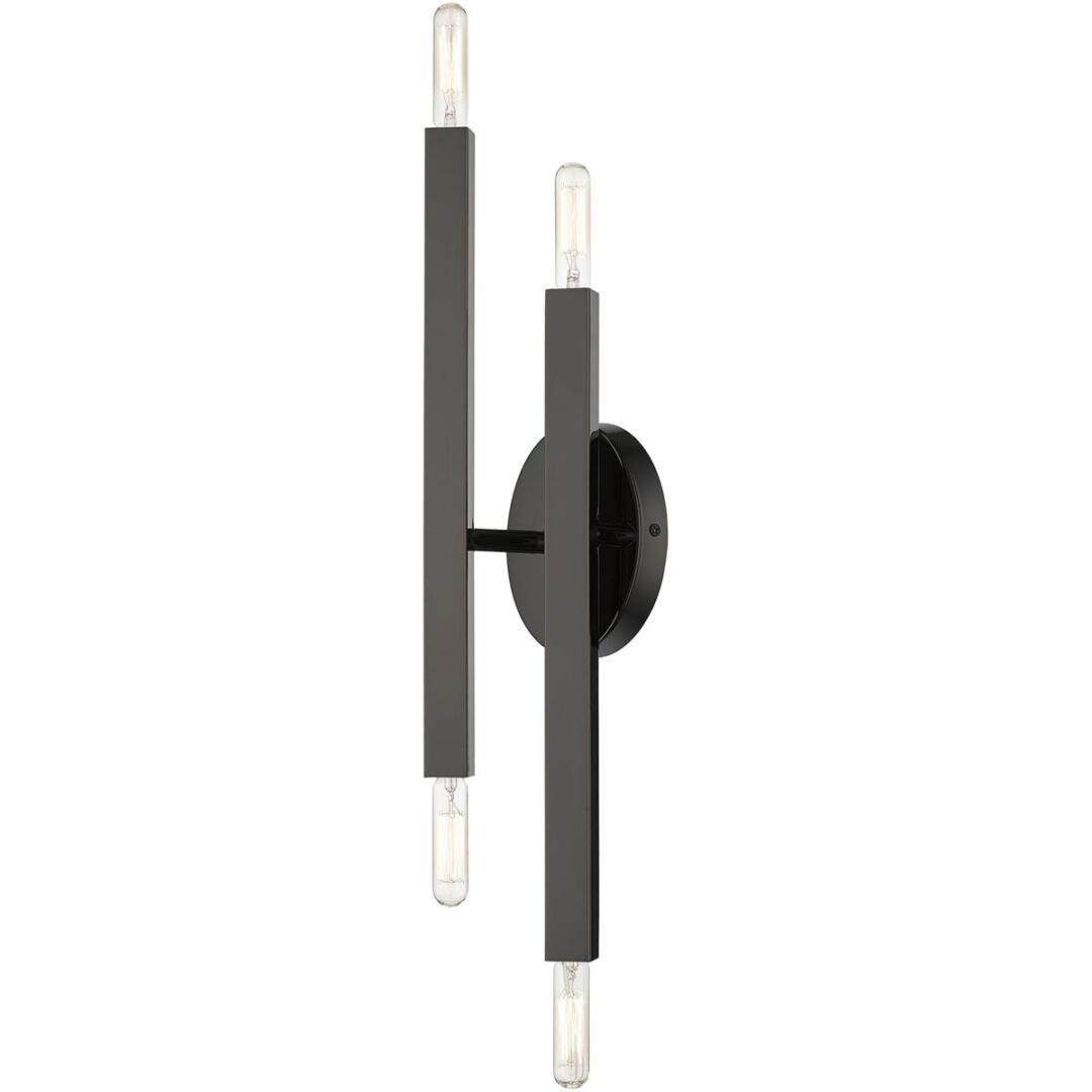 The Monaco collection inherits the multidirectional lines inspired by the Sputnik. The exposed bulbs glimmer at the end of each rectangular arm to create a touch of understated glamour for today’s modern spaces. The timeless design will add a sense of airiness and motion to any room. This four light sconce would look wonderful anyplace; bathrooms, living rooms, modern dining rooms, hallways or bedrooms. It is presented in a black chrome finish.