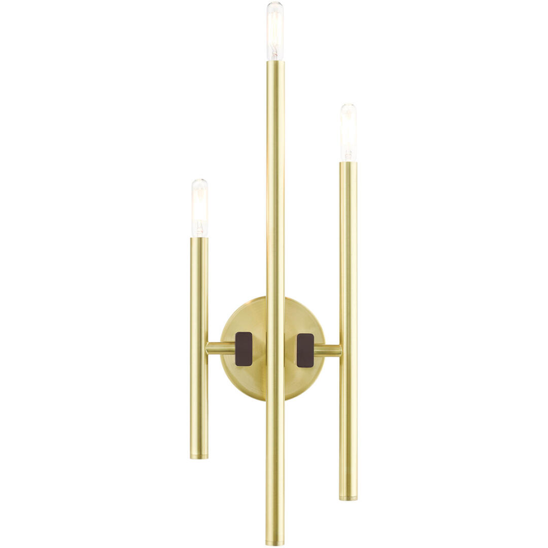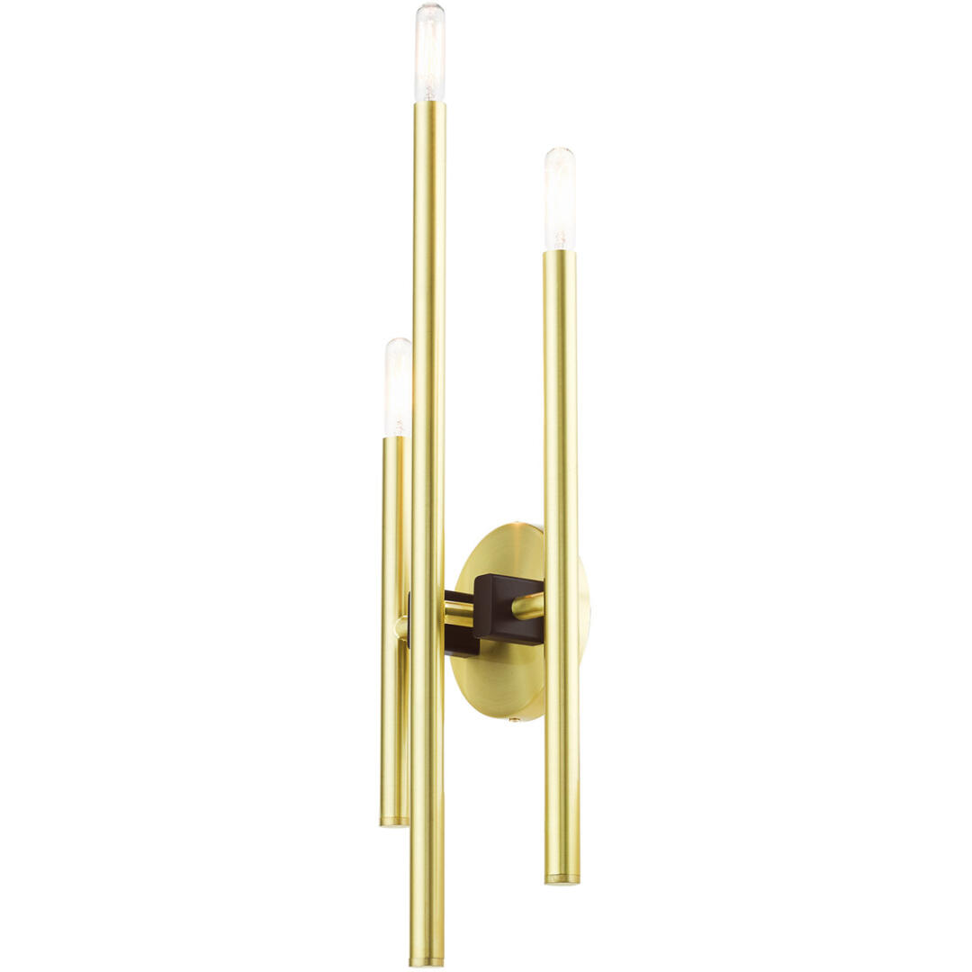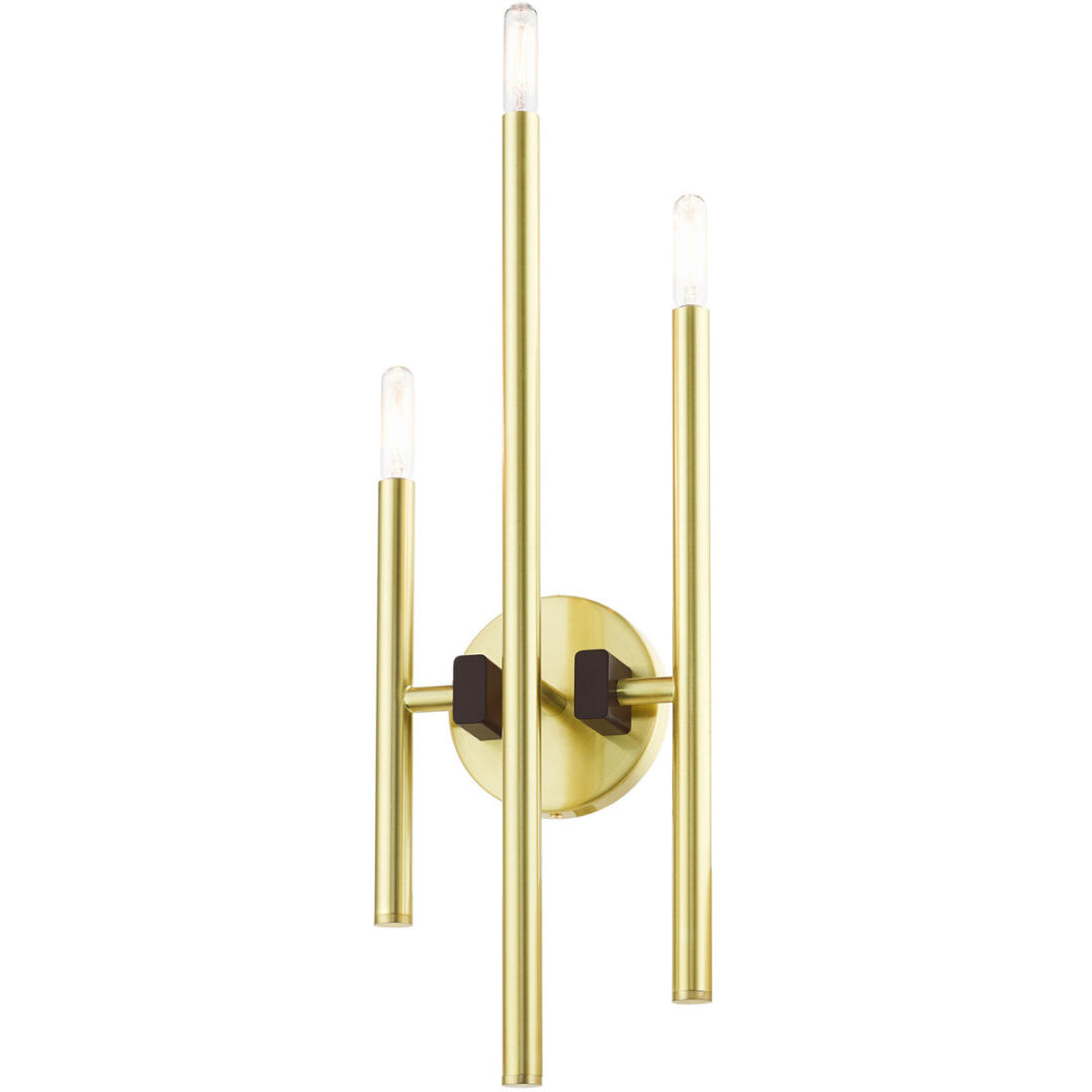 The clean lines of the Denmark collection remind of early modern Scandinavian style. The slim candles rise on the contrasting bar at different heights dynamically emulating the shape of a city skyline. This triple-light exposed bulb sconce comes in a satin brass finish accented with bronze finish bars. Versatile enough for almost any interior where dramatic statement is needed such as a bathroom, hallway, dining room, living room or bedroom.