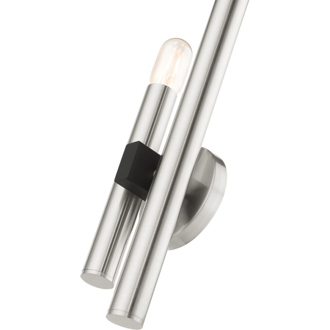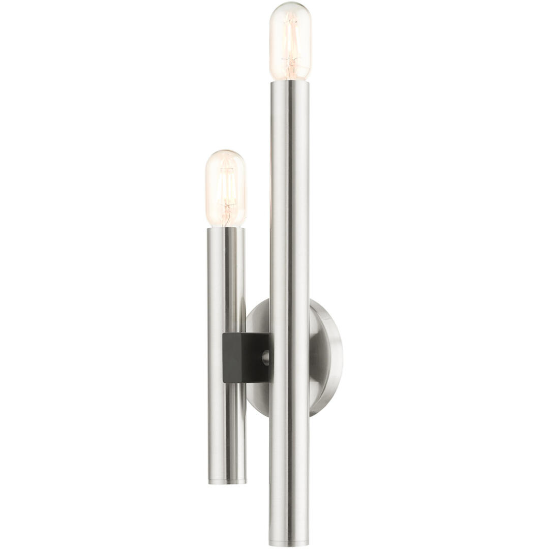 The dramatic lines of the Helsinki collection remind of early modern Scandinavian style. The massive candles rise on the contrasting bar at different heights dynamically emulating the shape of a city skyline. This double light exposed bulb sconce comes in a brushed nickel finish accented with a black finish bar. Great for any space where dramatic statement is needed such as a bathroom, hallway, dining room, living room or bedroom.