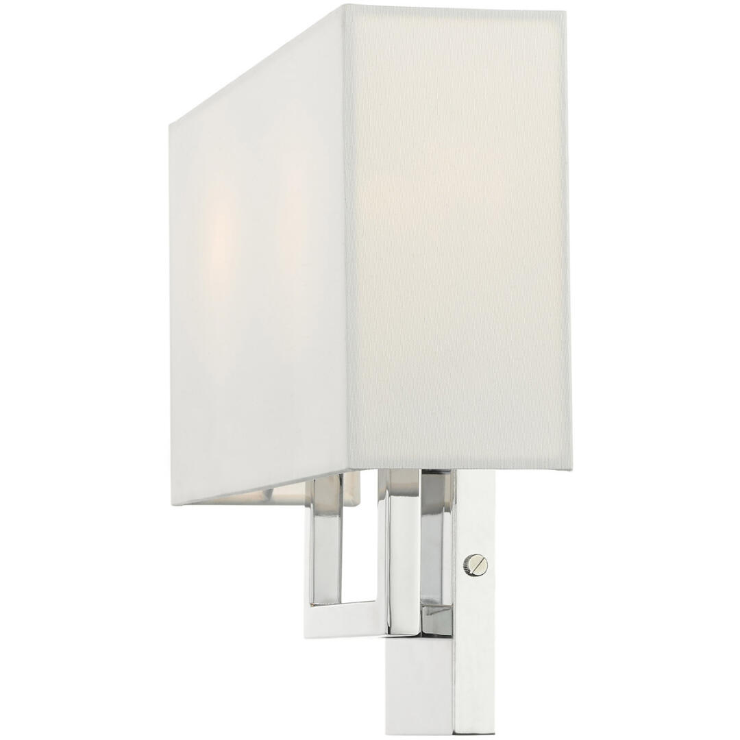 The contemporary design of the Pierson wall sconce is as beautiful as it is simple. An open rectangle, polished chrome finish frame is paired with a light and airy horizontal rectangle off-white fabric hardback shade.