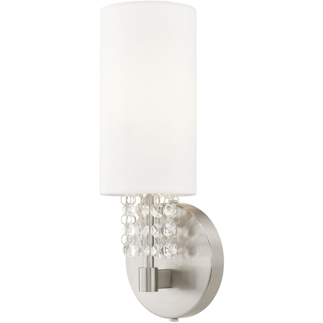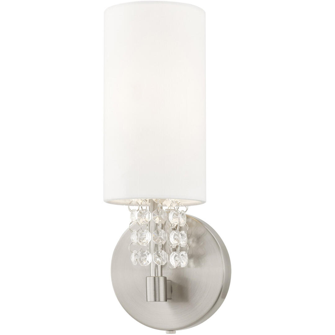 A contemporary style wall sconce from the Carlisle collection. The design features a brushed nickel wall sconce, with hanging strands of beautiful clear crystal. The crystal drapes from a hand crafted off white fabric hardback shade and creates a magnificently sophisticated look.