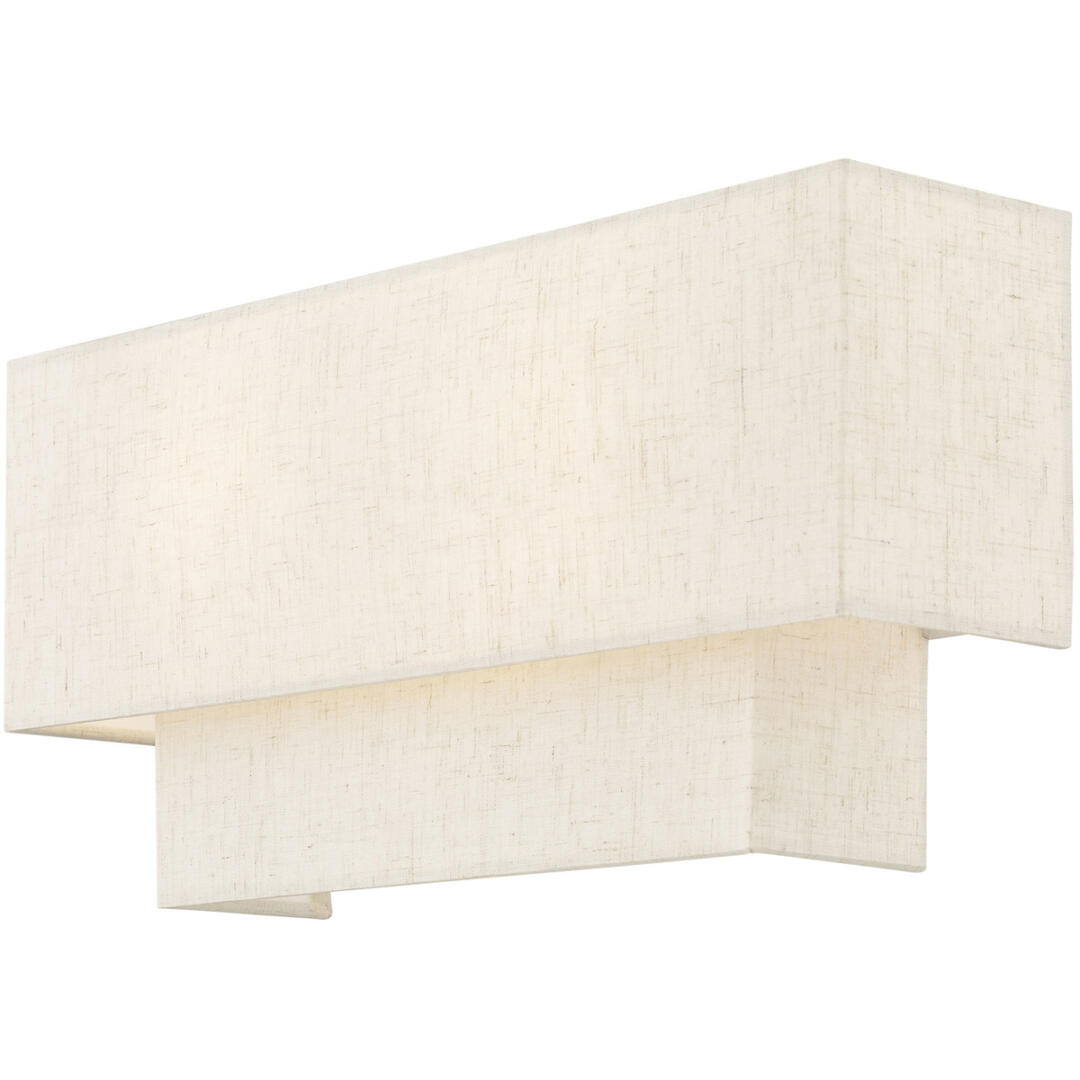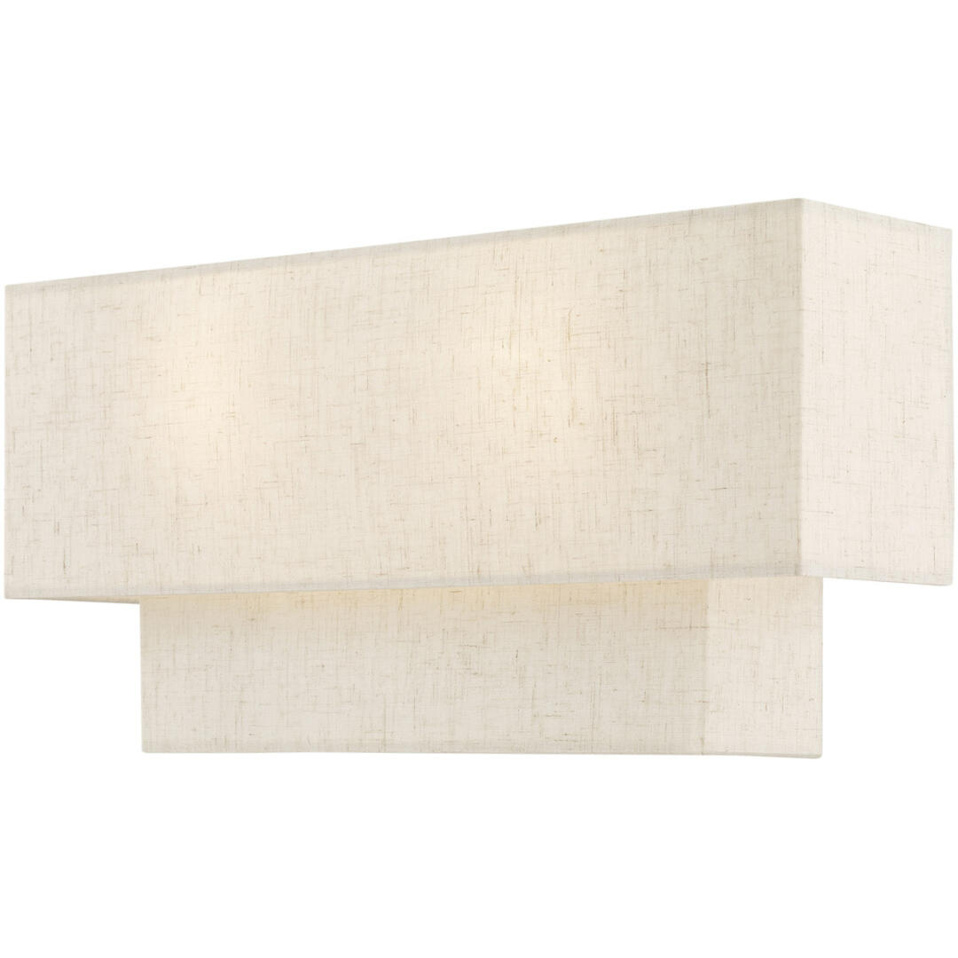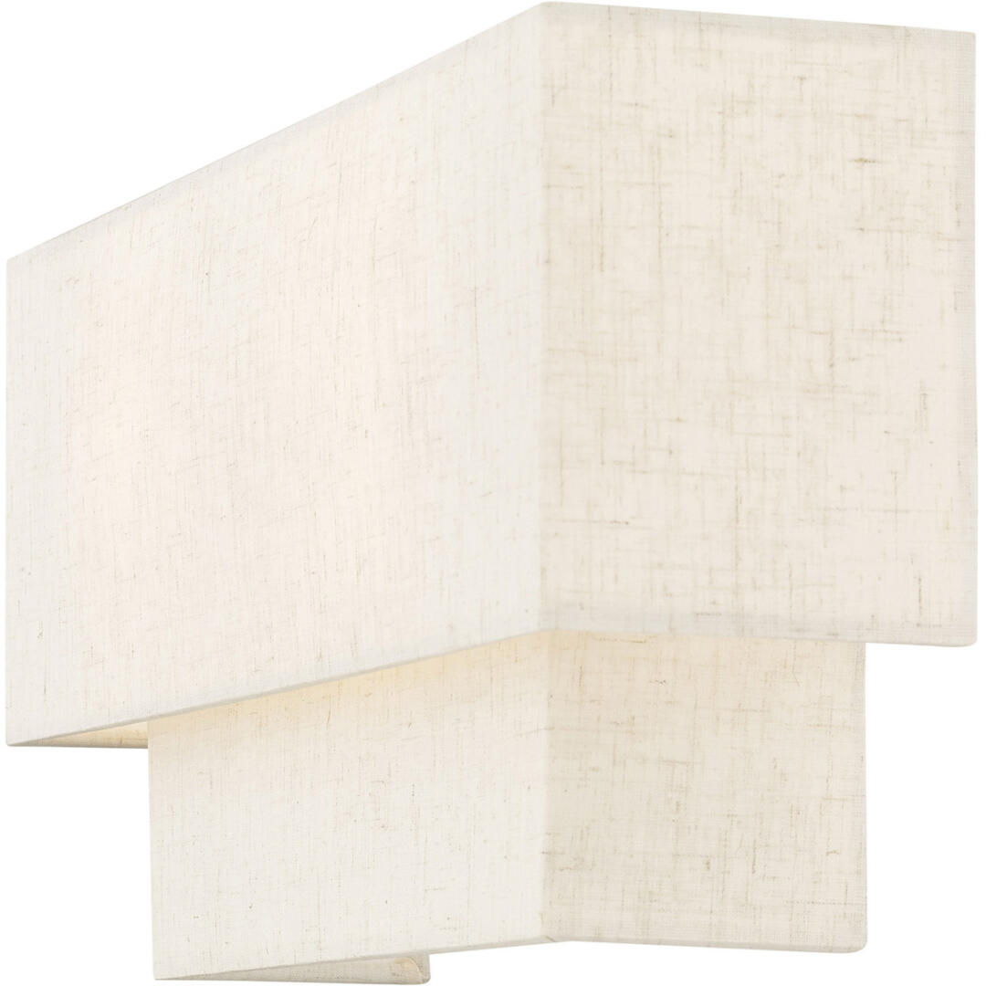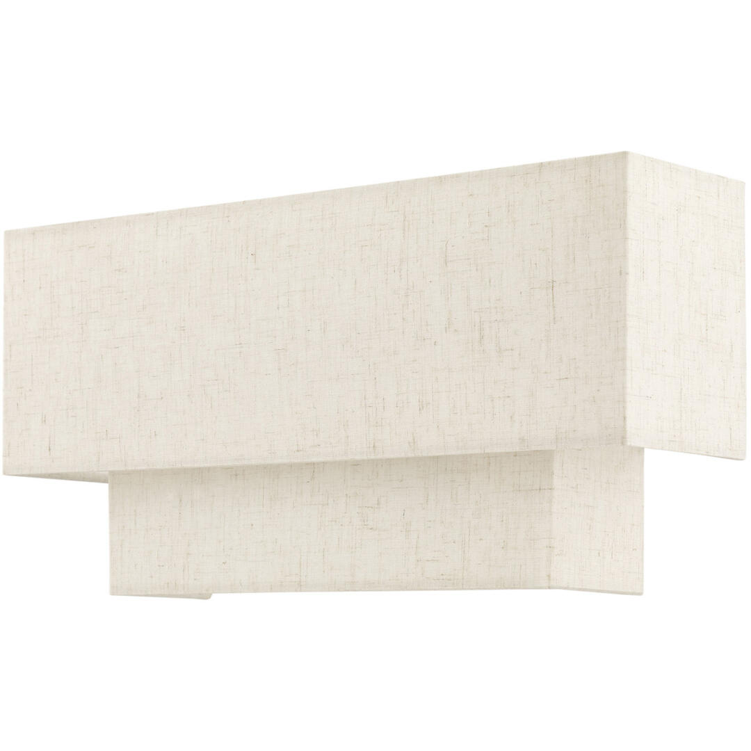 The sleek style and simple design of this wall sconce, makes it easy to use in any space. The double hand crafted off-white fabric hardback shade gives it a clean look.