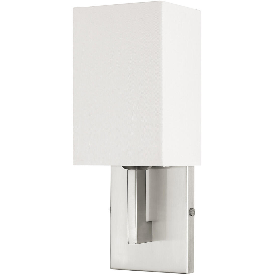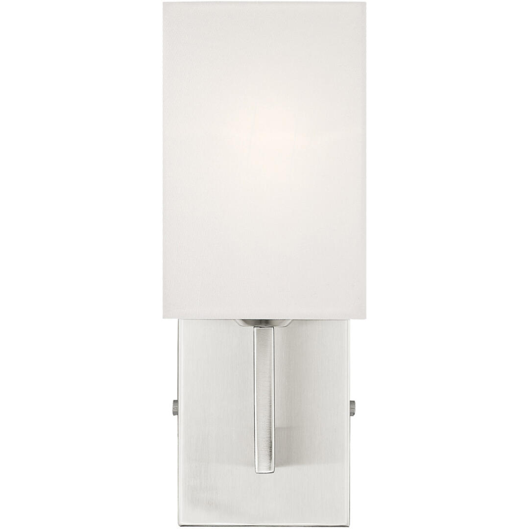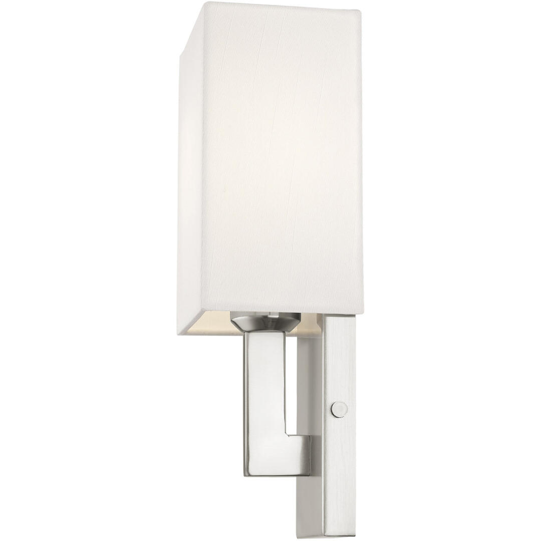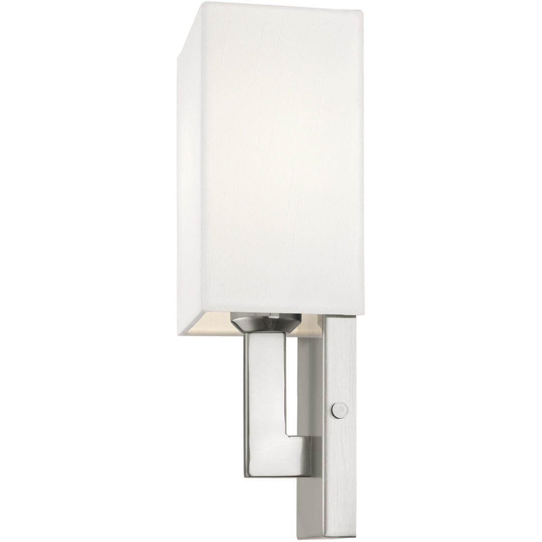 This wall sconce has a clean, crisp look and contemporary appeal. The sleek back plate and angular arm feature a brushed nickel finish. The hand crafted off white fabric hardback shade offers warm light for your surroundings.