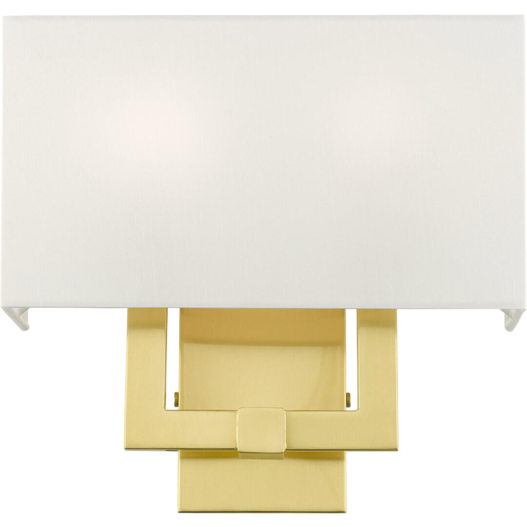 This wall sconce has a clean, crisp look and contemporary appeal. The hand-crafted off-white fabric hardback shade offers a diffused warm light. The handsomely styled two-light sconce adds character to almost any interior. Will adapt well in the hallway, bathroom, bedroom or over the fireplace tastefully elevating your style. This sleek design is shown in a satin brass finish.