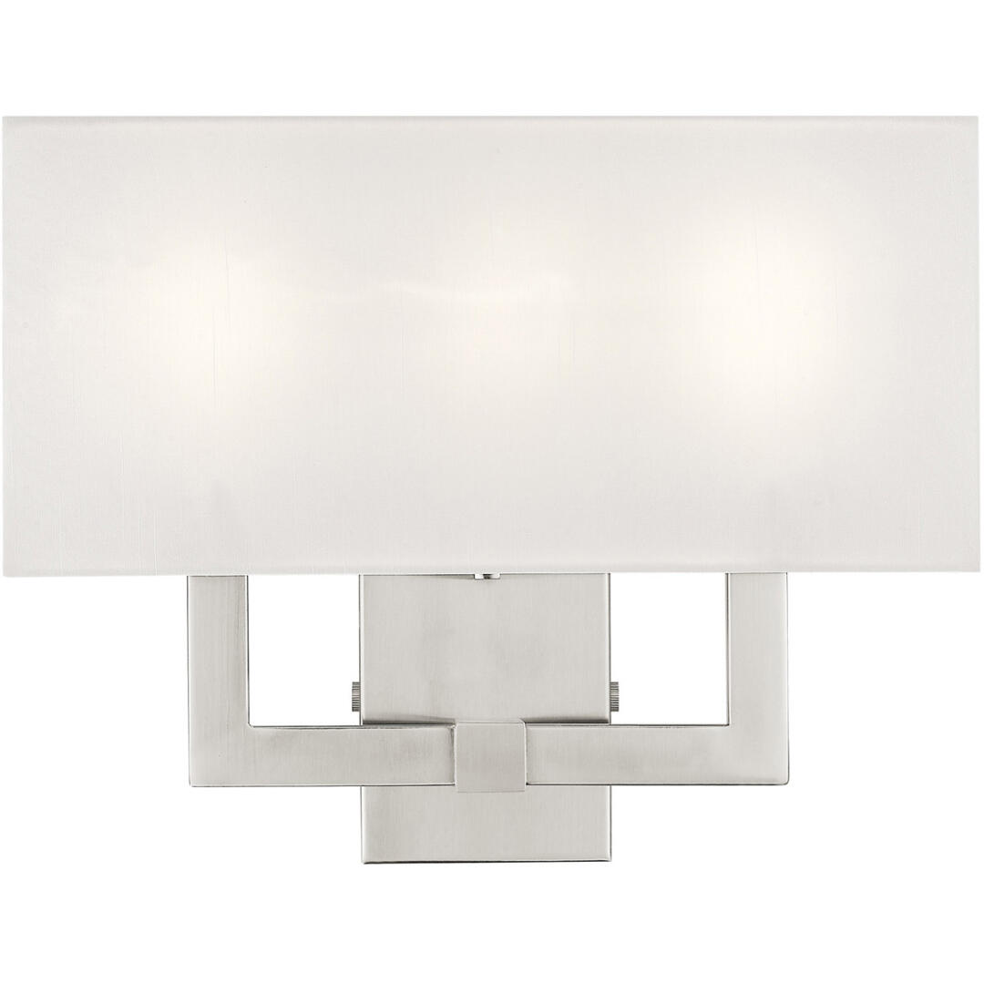 This wall sconce has a clean, crisp look and contemporary appeal. The sleek back plate and angular arm feature a brushed nickel finish. The hand crafted off white fabric hardback shade offers warm light for your surroundings.
