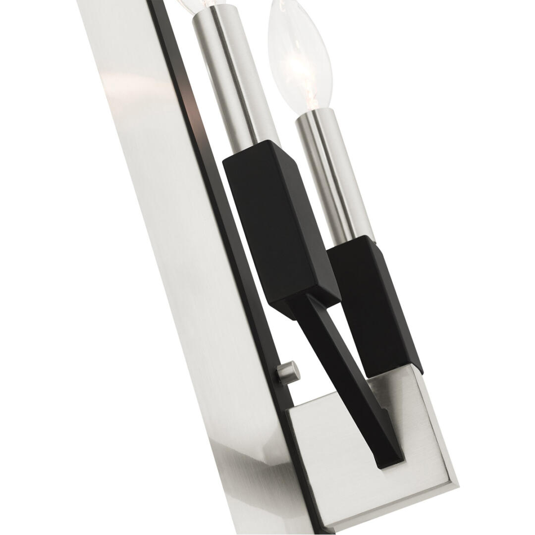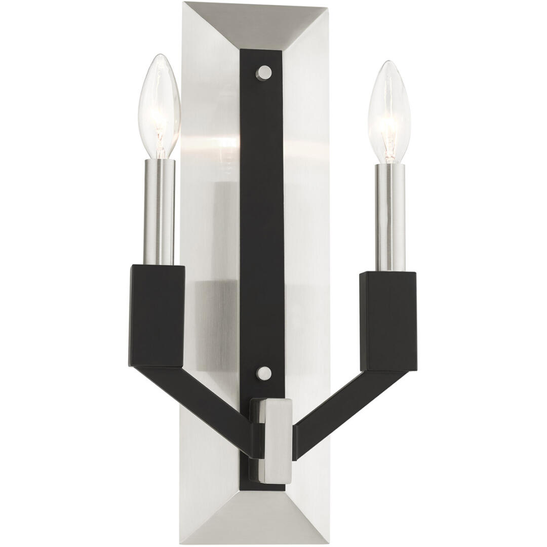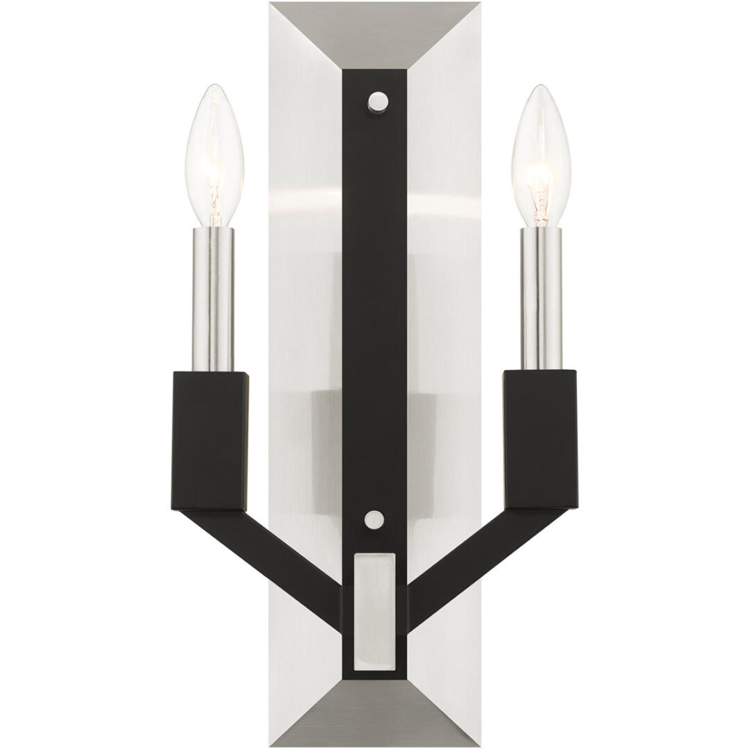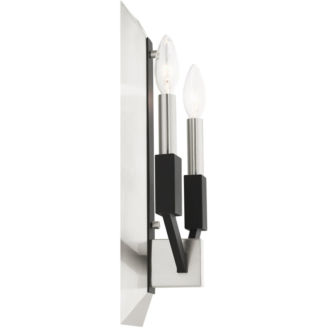 Illuminate your home with a bright design from the Beckett collection. This two light wall sconce emulates a mid-century modern style made popular in the 50s and 60s. The brushed nickel frame is combined with black accents. Perfect for a contemporary or transitional luxury bathroom, bedroom or hallway setting.